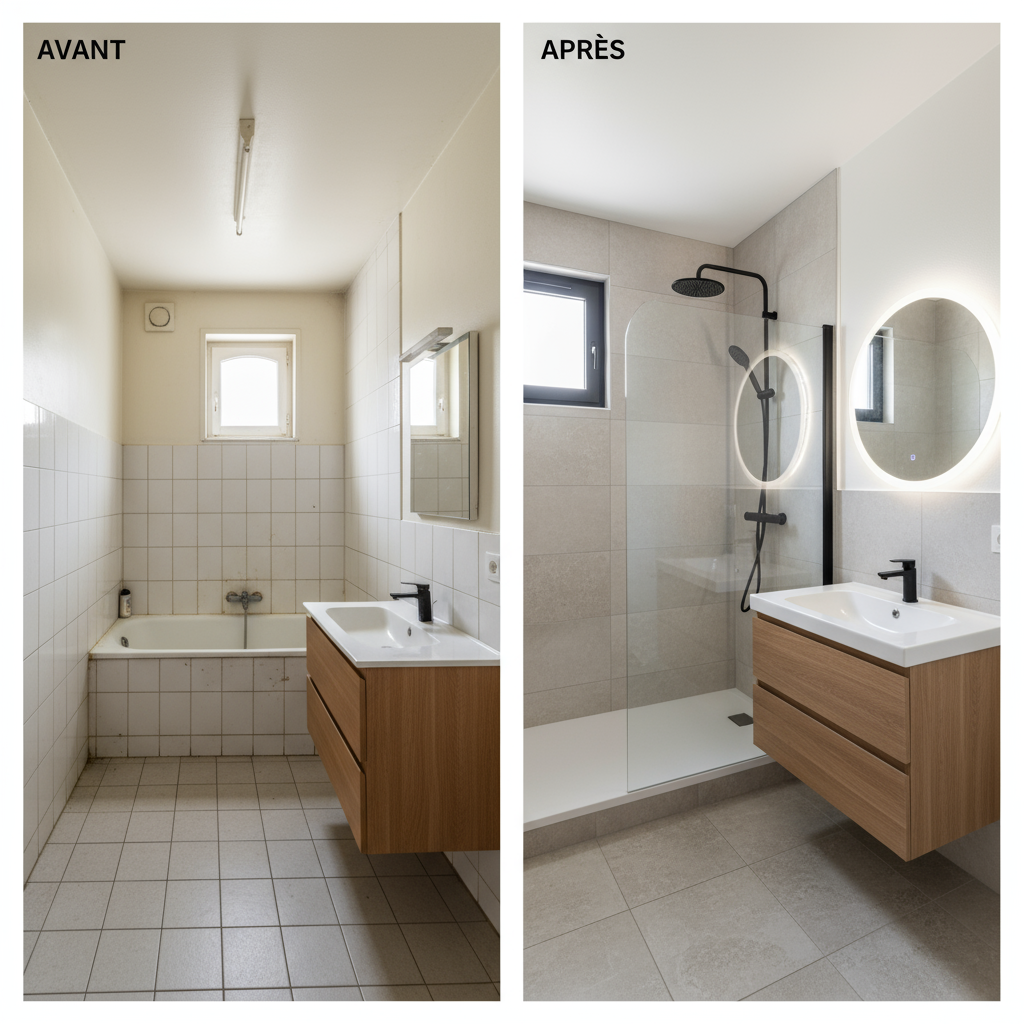 Conseil : anticipez les délais de livraison (parois de douche, carrelage XXL) pour éviter un chantier « à trous ».